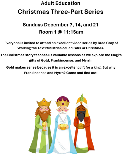 Adult Education is intended to provide educational opportunities for adults as a means to further develop their knowledge and love for the Lord. Various topics are chosen to both inspire and challenge. Missionary presentations and other events are also offered periodically.